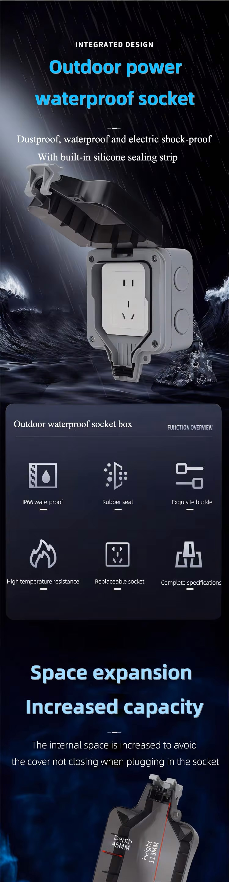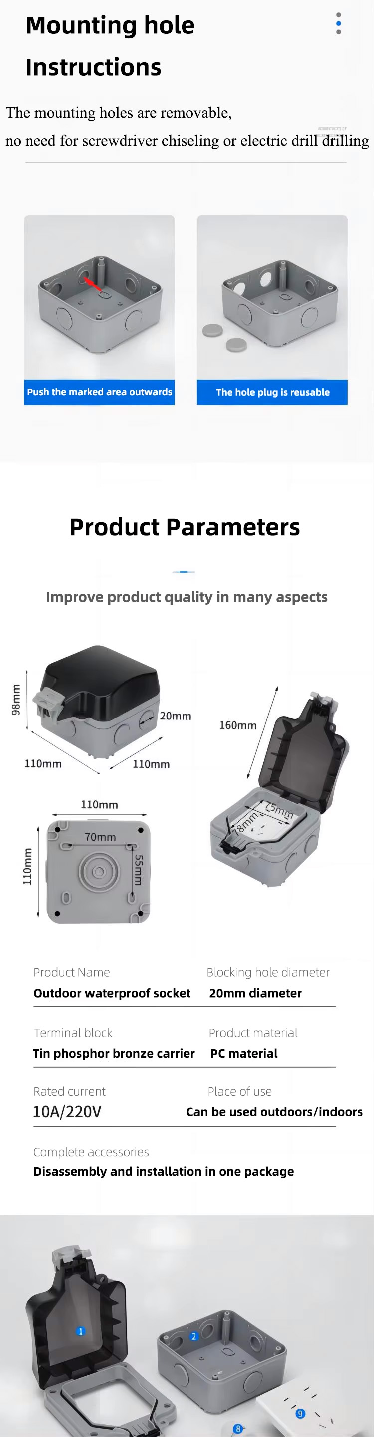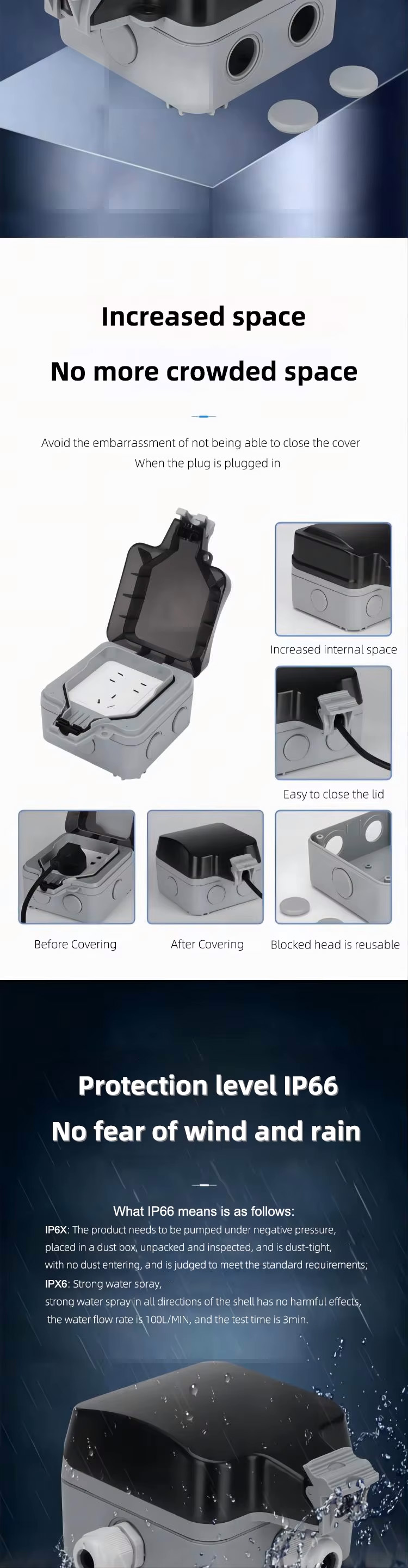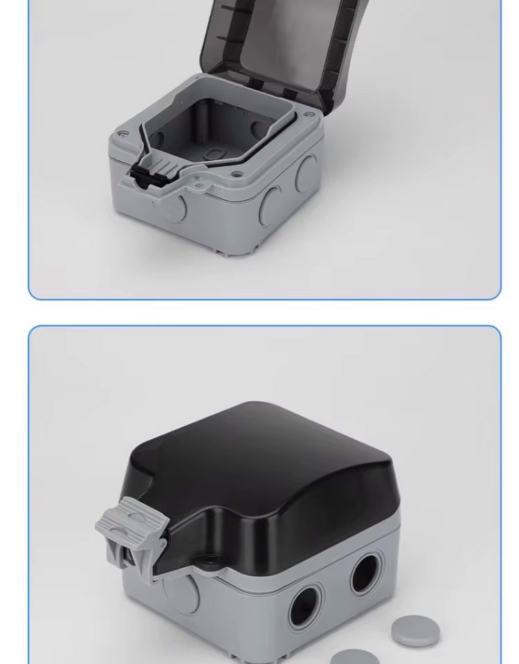 BG1G Waterproof junction boxProduct Item:BG1GExternal dimensions:158mm*93mm*106mmMaterial:PCProtection level:IP66type:Outlet BoxSurface treatment:ABS PlasticApplication:ResidentialCertification:CE,ROHS,REACHStyle:UpgradedColor:Black cover, gray shellTechnical Support:7*24h Online ServiceCategory:Waterproof junction box Inquiry